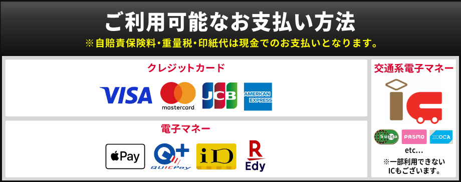 お支払いは現金の他、カードも取り扱いしています!※自賠責保険料・重量税・印紙代は現金でのお支払いとなります。